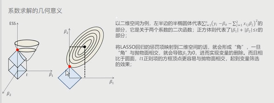 在线性回归模型的基础上添加了一个L1惩罚项(也叫做绝对值项、正则项) 相较于岭回归,模型的复杂度有所降低 # 该模型最终转变成求解正方体与椭圆抛物线的焦点问题