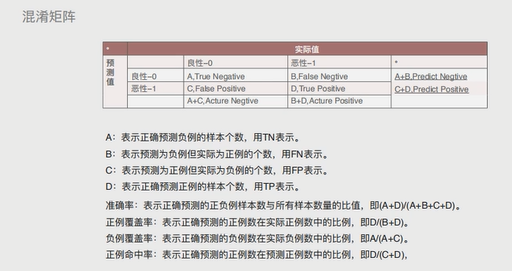 准确率:表示正确预测的正负例样本数与所有样本数量的比值,即(A+B)/(A+B+C+D) 正例覆盖率:表示正确预测的正例数在实际正例数中的比利,即D/(B+D) 负例覆盖率:表示正确预测的负例数在实际负例数中的比利,即A/(A+C) 正例命中率:表示正确预测的正例数在预测正例数中的比利,即D/(C+D)
