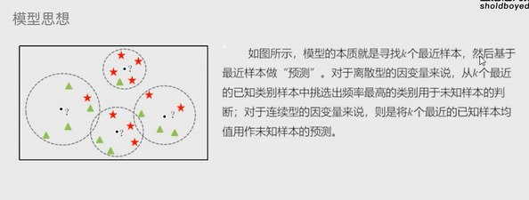 思想:根据未知样本点周围的K个邻居样本完成预测或者分类。
