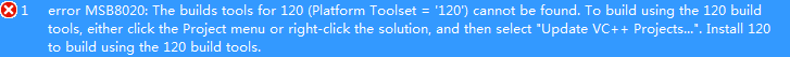 问题的原因在于项目导入到VS2012或者更高版本导入项目解决方案之后,项目的平台工具集默认为v120,而该版本的VS不支持,该问题的解决方案是检查每一个项目的平台工具集(项目右键—>属性—>配置属性—>常规—>平台工具集),修改为v110。