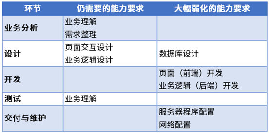 从以上表格中我们不难看出,传统软件开发方式对开发团队的技能要求非常全面,从商业到运维,从设计到开发。所以,软件开发通常都是“团队作业”,每个成员分别贡献出对应的能力领域。而随着低代码技术的出现,设计、开发和交付环节的技术要求,因为技术门槛的降低而取消或者弱化。