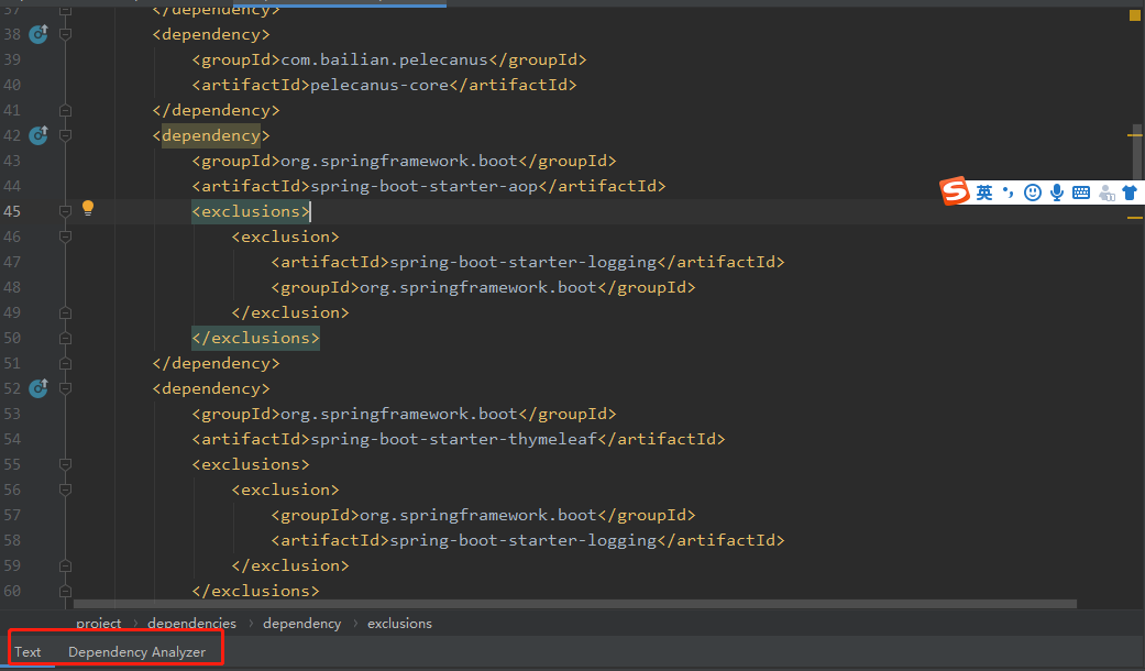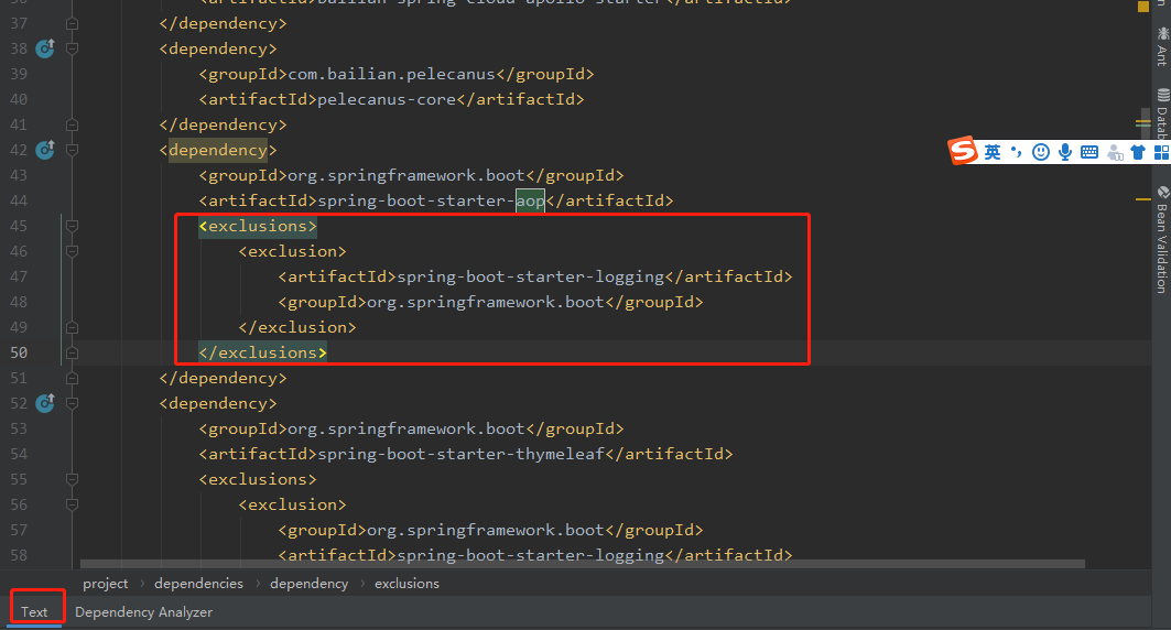 4.切换回text视图可以看到在spring-boot-starter-aop的依赖中已经排除了spring-boot-starter-logging依赖了。