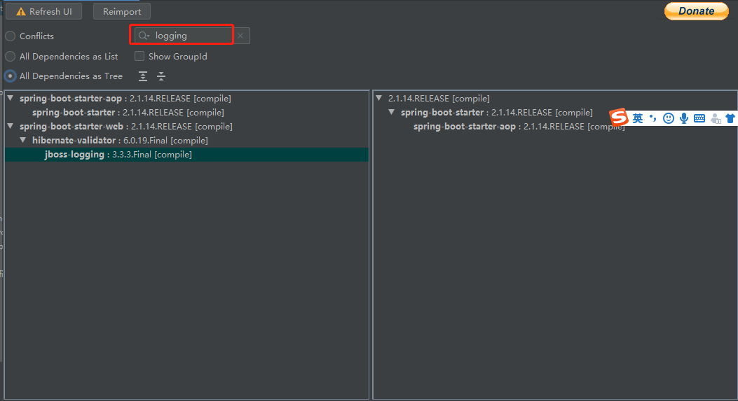 2.输入查找的依赖名称,得到的结果是模糊搜索,例如我搜索的loggging,结果有spring-boot-starter-aop的子依赖spring-boot-starter-logging和spring-boot-starter-web的子依赖jboss-logging。如果有多个依赖了spring-boot-starter-logging而且版本不一样就会导致依赖冲突,一般需要排除低版本依赖,那么怎么排除呢?