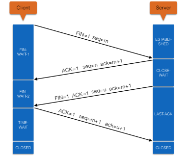 (1)Client向Server发送断开连接请求的报文段,seq=m(m为Client最后一次向Server发送报文段的最后一个字节序号加1),Client进入FIN-WAIT-1状态。