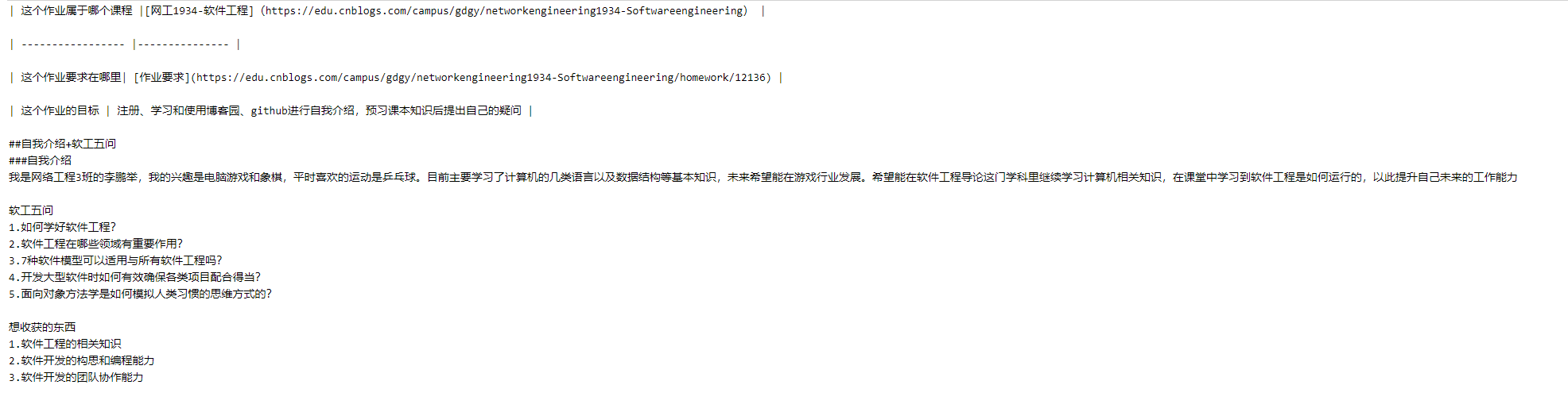| 这个作业的目标 | 注册、学习和使用博客园、github进行自我介绍,预习课本知识后提出自己的疑问 |
