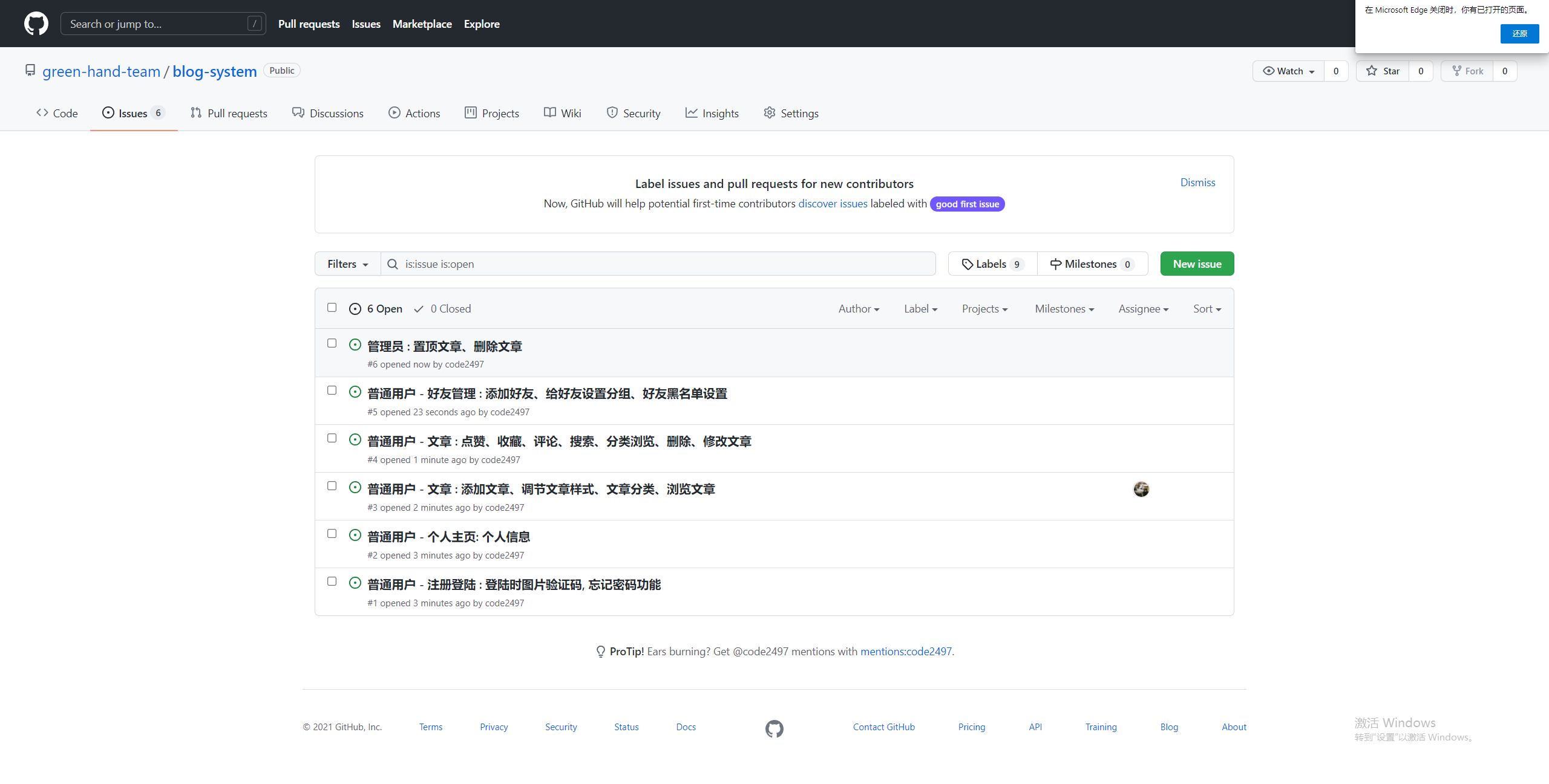 1、链接:Issues · green-hand-team/blog-system · GitHub