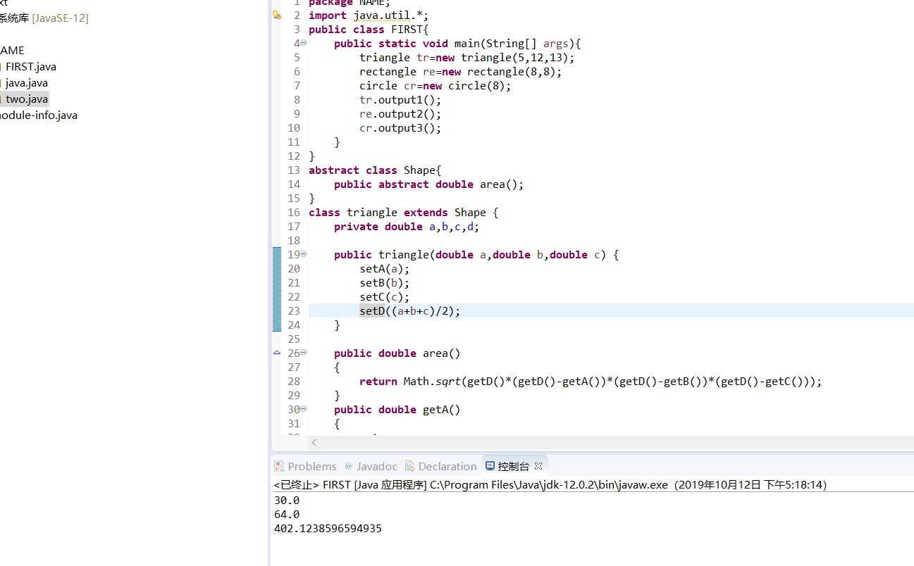 - 设计一个类层次,定义一个抽象类--形状,其中包括有求形状的面积的抽象方法。 继承该抽象类定义三角型、矩形、圆。 分别创建一个三角形、矩形、圆存对象,将各类图形的面积输出。