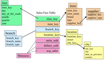 星形模式是一种多维的数据关系,它由一个事实表(Fact Table)和一组维表(Dimension Table)组成。每个维表都有一个维作为主键,所有这些维的主键组合成事实表的主键。事实表的非主键属性称为事实(Fact),它们一般都是数值或其他可以进行计算的数据;而维大都是文字、时间等类型的数据,按这种方式组织好数据我们就可以按照不同的维(事实表主键的部分或全部)来对这些事实数据进行求和(summary)、求平均(average)、计数(count)、百分比(percent)的聚集计算,甚至可以做20~80分析。这样就可以从不同的角度数字来分析业务主题的情况。