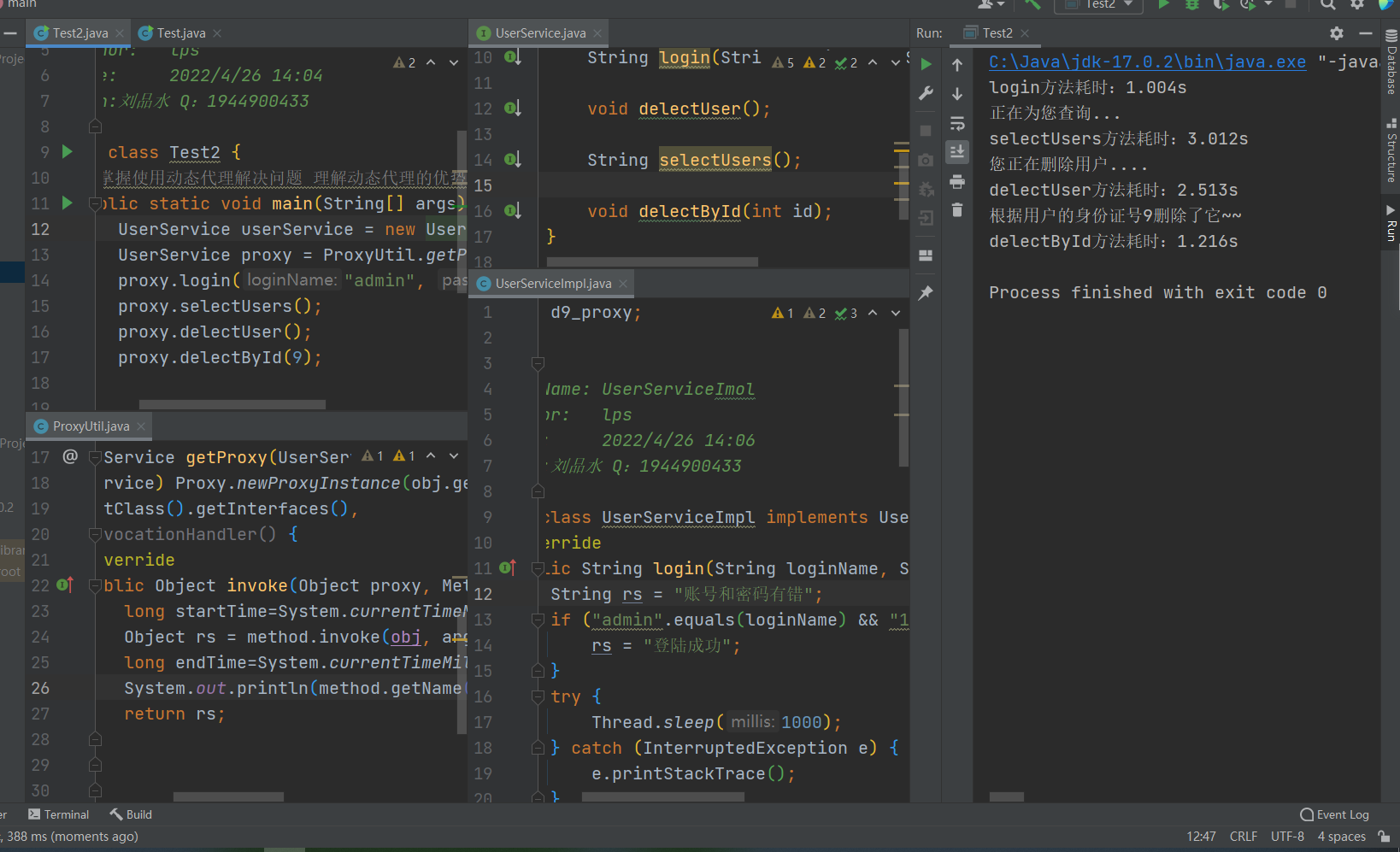 package d9_proxy; import java.lang.reflect.InvocationHandler; import java.lang.reflect.Method; import java.lang.reflect.Proxy; /** * FileName: ProxyUtil * Author: lps * Date: 2022/4/26 14:28 * Sign:刘品水 Q:1944900433 */ public class ProxyUtil { /** * 通过静态方法 为用户业务对象返回一个代理对象 */ public static UserService getProxy(UserService obj){ return (UserService) Proxy.newProxyInstance(obj.getClass().getClassLoader(), obj.getClass().getInterfaces(), new InvocationHandler() { @Override public Object invoke(Object proxy, Method method, Object[] args) throws Throwable { long startTime=System.currentTimeMillis(); Object rs = method.invoke(obj, args); long endTime=System.currentTimeMillis(); System.out.println(method.getName() +"方法耗时:"+(endTime-startTime)/1000.0+"s"); return rs; } }); } }