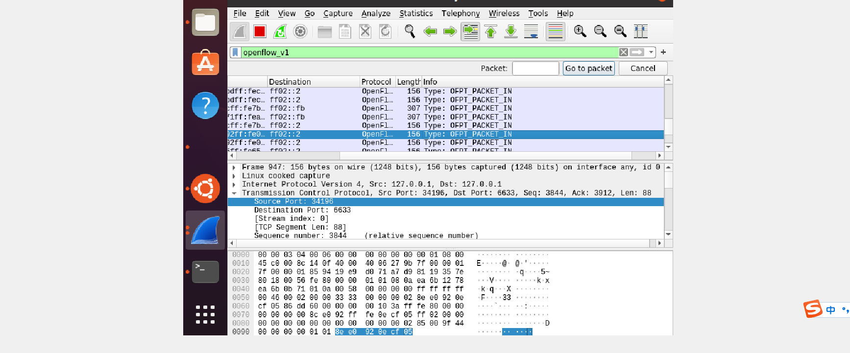 (想要抓到完整的openflow数据包需要先打开wireshare再run你的拓扑,或者打开编译好的py文件;wireshare不知道抓什么接口可以直接抓any接口)