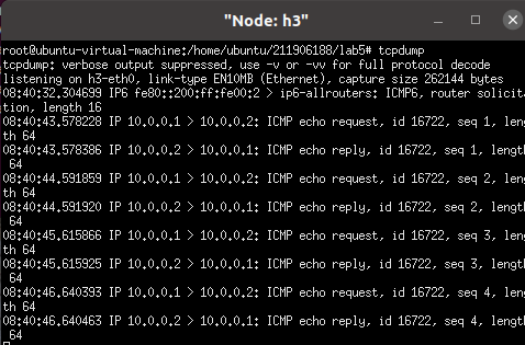 总结:hub情况下两台主机都会有收到数据包,而l2_learning情况下只有ping的那台主机才有数据包