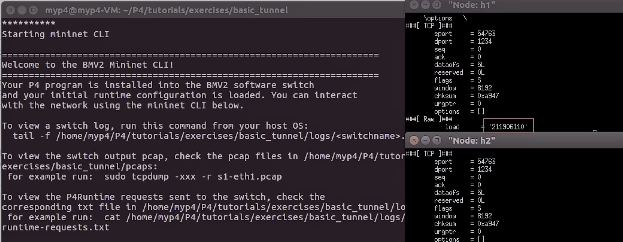 1.截图举例,h1通过隧道转发与h2通信