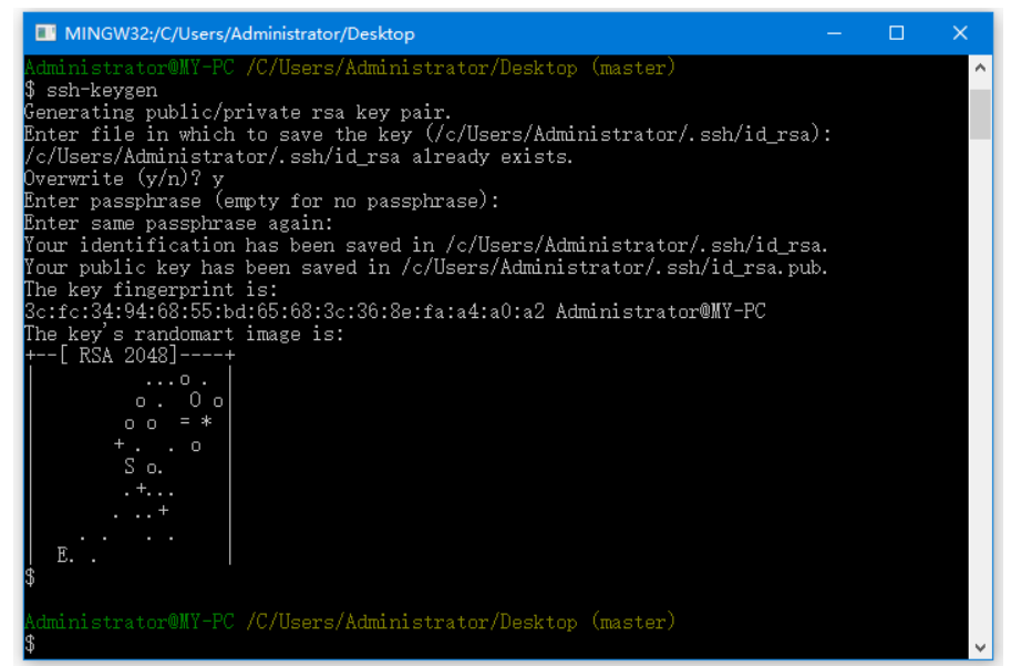 它会提示’输入保存密钥的文件(//.ssh/id_rsa):’,只需键入文件名并按回车。 接下来提示输入密码显示“输入密码(空密码)”。 输入一些密码并按回车。 您将看到生成的SSH密钥,如下图所示: