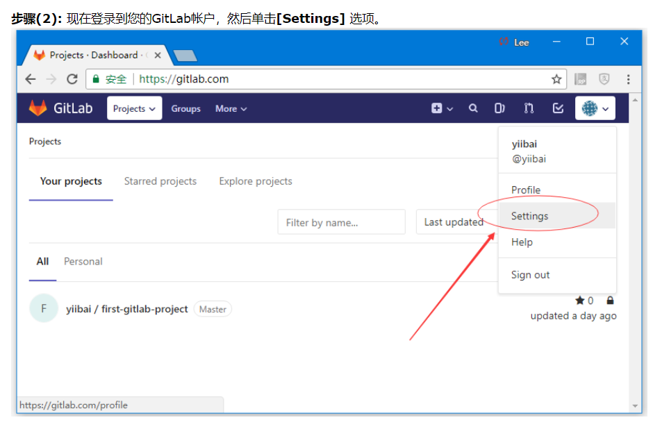 步骤(2): 现在登录到您的GitLab帐户,然后单击[Settings] 选项。