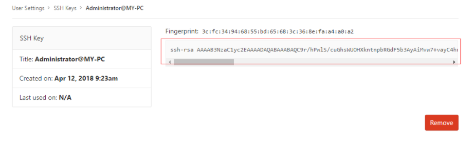 步骤(6): 单击添加密钥(Add key)按钮,将SSH密钥添加到您的GitLab。 您将看到SSH密钥的简短版本,标题和创建日期,如下图所示: