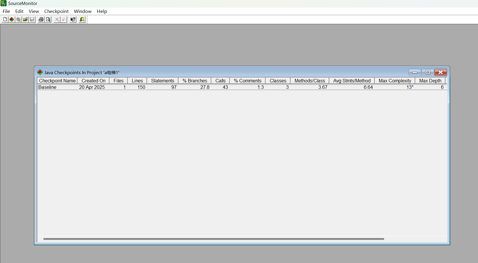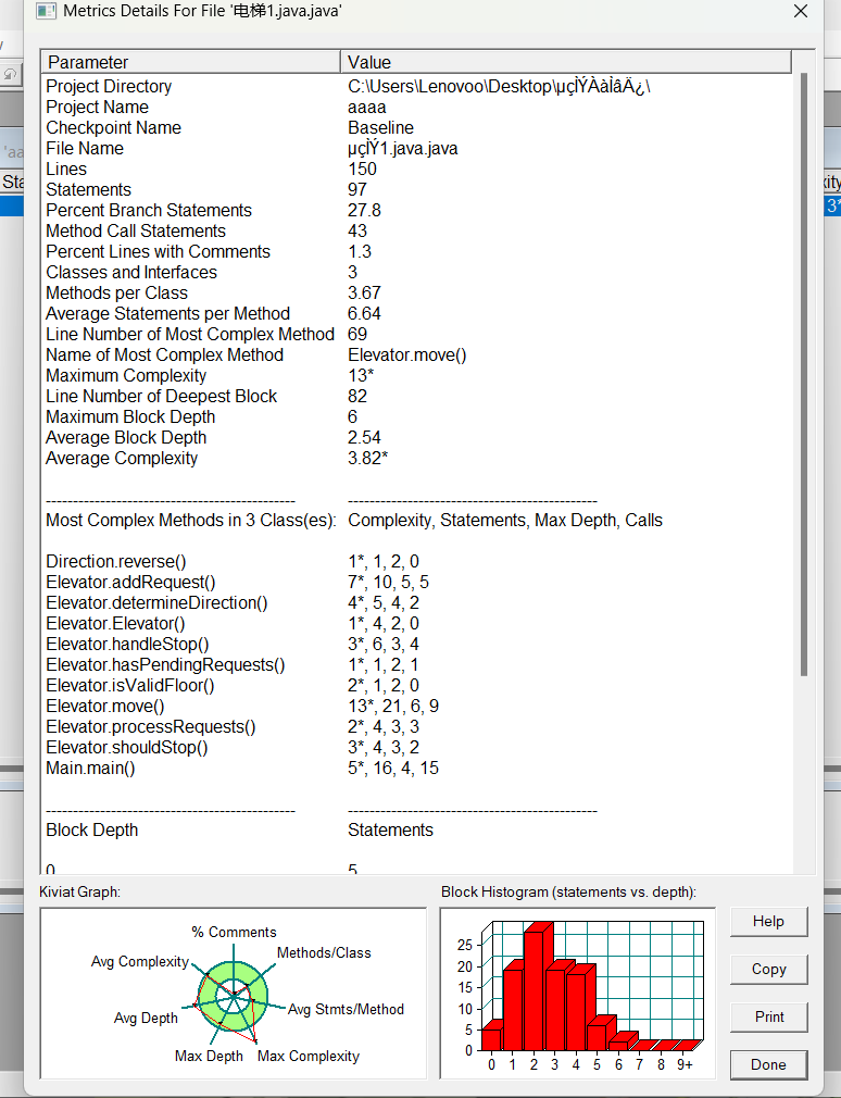 - Name of Most Complex Method:最复杂方法名称,为 Elevator.move() 。