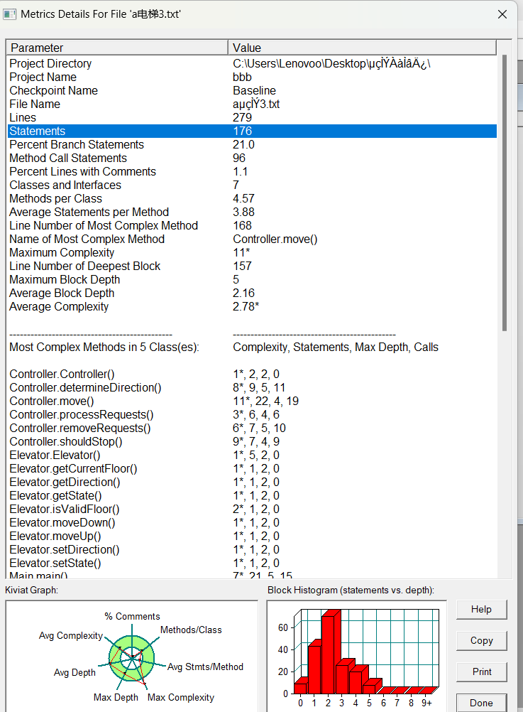- 列出了不同类中较复杂的方法,以及其复杂度(Complexity)、语句数(Statements)、最大深度(Max Depth)和方法调用数(Calls) 。例如 Elevator.move() 方法,复杂度为 13* ,有 21 条语句,最大深度为 6,方法调用数为 9 。