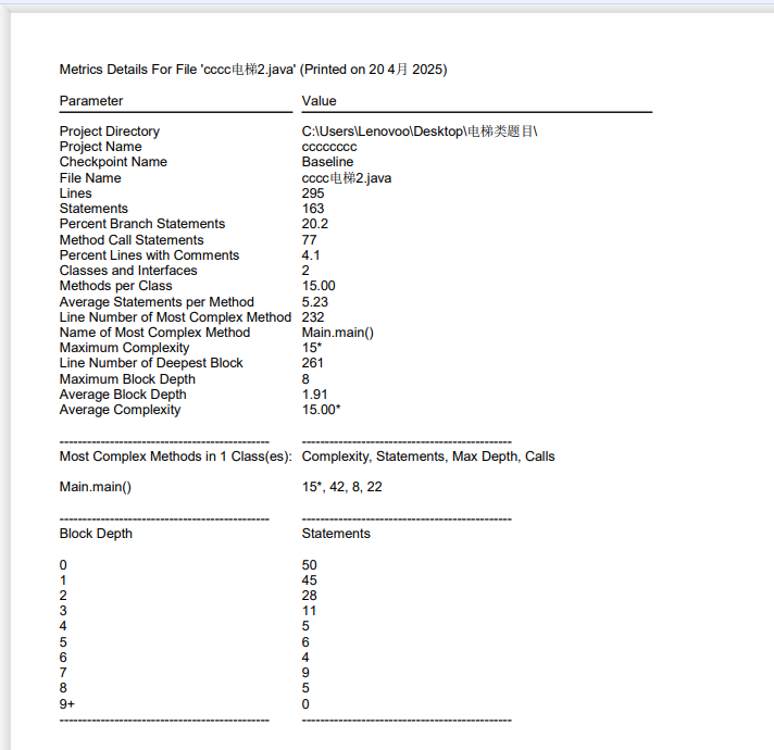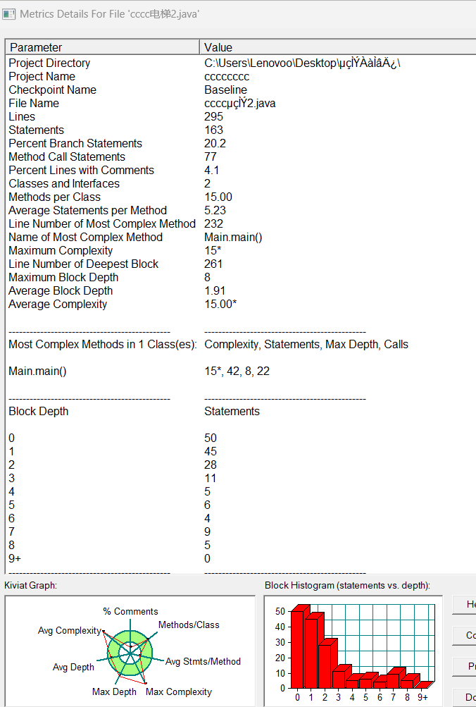 仅列出Main.main()方法,其复杂度为 15* ,有 42 条语句,最大深度为 8,方法调用数为 22 。说明该方法复杂度较高,代码量和嵌套层次相对较多,方法间调用也较频繁。