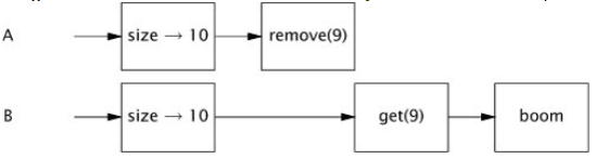 //在一个线程执行remove后,另一个线程再去执行get,这时候就会发生ArrayIndexOutOfBoundsException。 //由于没有进行同步,线程获取到的Vector大小是失效的。 public static Object getLast(Vector list) { int lastIndex = list.size() - 1; return list.get(lastIndex); } public static void deleteLast(Vector list) { int lastIndex = list.size() - 1; list.remove(lastIndex); } //所以,要对线程操作进行同步,同步容器类是通过自身的锁来保护它的每个方法的,我们也要采取这种加锁方式 public static Object getLast(Vector list) { synchronized (list) { int lastIndex = list.size() - 1; return list.get(lastIndex); } } public static void deleteLast(Vector list) { synchronized (list) { int lastIndex = list.size() - 1; list.remove(lastIndex); } }