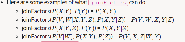 def joinFactors(factors): """ Question 3: Your join implementation Input factors is a list of factors. You should calculate the set of unconditioned variables and conditioned variables for the join of those factors. Return a new factor that has those variables and whose probability entries are product of the corresponding rows of the input factors. You may assume that the variableDomainsDict for all the input factors are the same, since they come from the same BayesNet. joinFactors will only allow unconditionedVariables to appear in one input factor (so their join is well defined). Hint: Factor methods that take an assignmentDict as input (such as getProbability and setProbability) can handle assignmentDicts that assign more variables than are in that factor. Useful functions: Factor.getAllPossibleAssignmentDicts Factor.getProbability Factor.setProbability Factor.unconditionedVariables Factor.conditionedVariables Factor.variableDomainsDict """ # typecheck portion setsOfUnconditioned = [set(factor.unconditionedVariables()) for factor in factors] if len(factors) > 1: intersect = functools.reduce(lambda x, y: x & y, setsOfUnconditioned) if len(intersect) > 0: print("Factor failed joinFactors typecheck: ", factors) raise ValueError("unconditionedVariables can only appear in one factor. \n" + "unconditionedVariables: " + str(intersect) + "\nappear in more than one input factor.\n" + "Input factors: \n" + "\n".join(map(str, factors))) """iterate over assignments in newFactor.getAllPossibleAssignmentsDicts(): iterate over factors: Call factor.getProbability(assignment) [and do something with it so you can do the setProbability step in the next line] setProbability in the newFactor.""" "*** YOUR CODE HERE ***" #获取所有的Factor allFactors=[factor for factor in factors] conditional=set([]) unconditional=set([]) # 将变量分为conditional和unconditional的 for factor in allFactors: for f in factor.conditionedVariables(): conditional.add(f) for f in factor.unconditionedVariables(): unconditional.add(f) # 如果变量在unconditional里出现过,那么它做乘积后就在unconditional里 conditional=list(filter(lambda x: x not in unconditional, conditional)) variableDomainsDict=allFactors[0].variableDomainsDict() newCPT = Factor(unconditional, conditional, variableDomainsDict) for assignment in newCPT.getAllPossibleAssignmentDicts(): probability = 1 for factor in allFactors: probability = probability * factor.getProbability(assignment) newCPT.setProbability(assignment, probability) return newCPT "*** END YOUR CODE HERE ***"