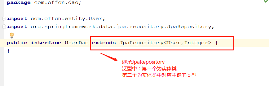1 package com.offcn.dao; 2 3 import com.offcn.entity.User; 4 import org.springframework.data.jpa.repository.JpaRepository; 5 6 public interface UserDao extends JpaRepository<User,Integer> { 7 }