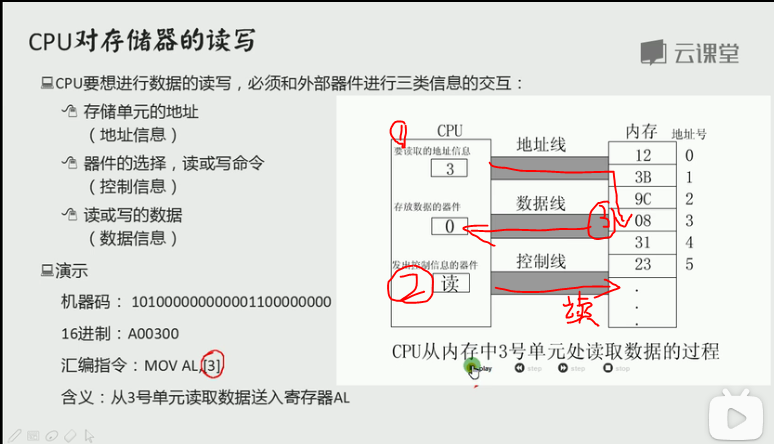 1.cpu发出要读取的地址信息3给内存,内存搜索到地址号为3的数据。