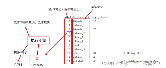 执行的时候如果PC发出的指令序号是5,那么这里就会执行存储操作,然后会执行操作局部变量表,操作数栈等等,最后还要再转换成机器指令给CPU来执行。