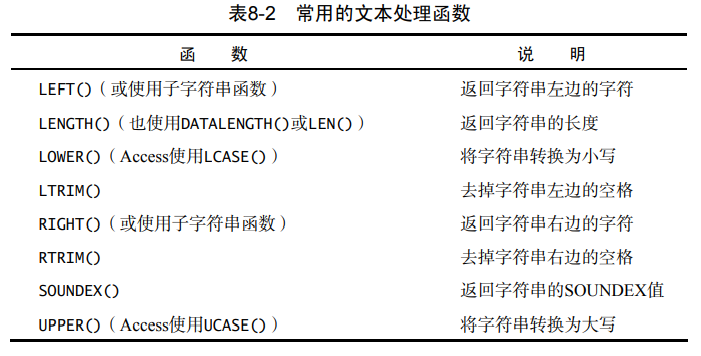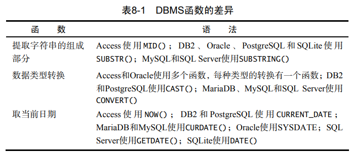每一个DBMS都有特定的函数。事实上,只有少数几个函数被所有主要的 DBMS 等同地支持。虽然所有类型的函数一般都可以在每个 DBMS 中使用,但 各个函数的名称和语法可能极其不同。为了说明可能存在的问题,表 8-1 列出了 3 个常用的函数及其在各个 DBMS 中的语法: