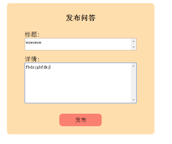 {% extends 'base.html'%} {% block title %} 发布问题 {% endblock %} {% block head %} <link href="{{url_for('static',filename='css/question.css') }}" rel="stylesheet" type="text/css"> {% endblock %} {% block main %} <form class="header" action="{{url_for('question')}}" method="post"> <h3 class="title">发布问答</h3> <div class="form-group"> <label for="questiontitle">标题:</label><br> <textarea class="form-control" rows="2" id="questiontitle" name="title"></textarea> </div> <div class="form-group"> <label for="questiondetail">详情:</label><br> <textarea class="form-control" rows="8" id="questiondetail" name="detail"></textarea> </div> <div class="checkbox"></div> <button type="submit" class="btn">发布</button> </form> {% endblock %}