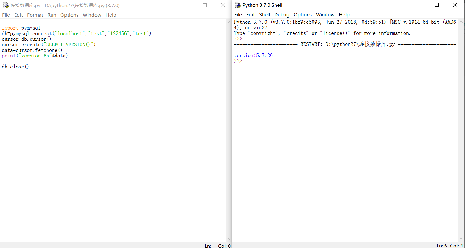 3.保存文本并修改文件后缀为py,使用Python自带的IDLE执行显示结果,结果应为数据库版本。