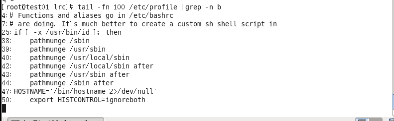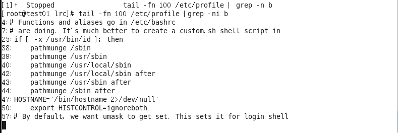 实例1:实时查找/etc/profile文件末尾100行含有b的行信息:tail -fn 100 /etc/profile | grep -n b