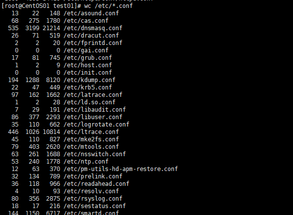 实例2:对多个/etc下的多个.conf文件统计:wc /etc/*.conf