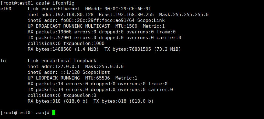 实例1、查看当前的网络接口配置信息:ifconfig