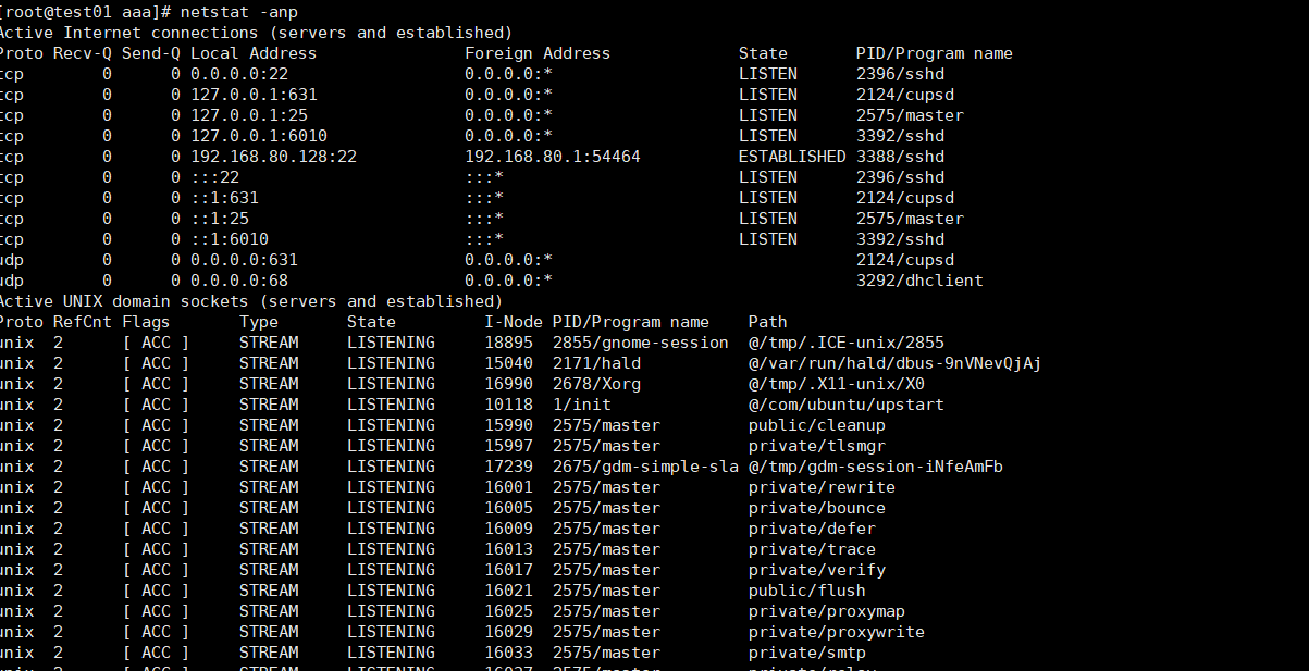 实例1、显示系统所有的网络服务:netstat -anp