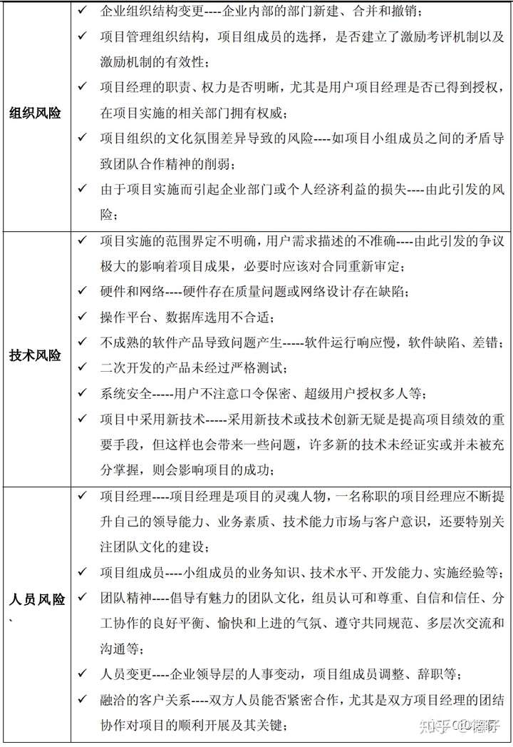 要求:项目经理和实施经理必须要有风险管理意识,注意参考以上提到的风险种类,识别出项目实施过程中的潜在风险,发现后及时提出解决措施。要与用户创造一种共担风险、共享成功的氛围。