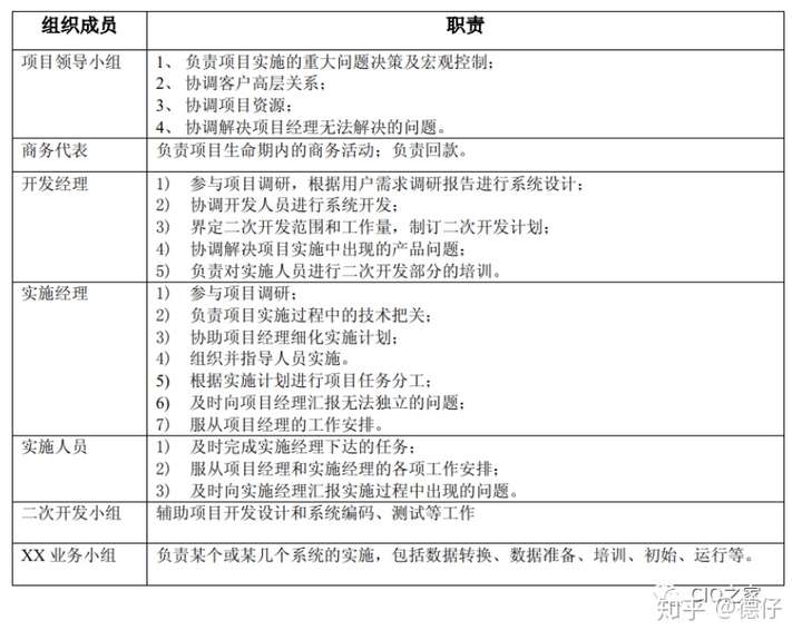 (1) 组织成立项目小组项目经理应对项目组成员角色提出需求层次,确定实施过程中项目组成员的安排,并根据不同阶段会同实施经理提出实施人员的增减要求,让已经完成任务的人员及时退出或暂时退出项目组,避免人力资源和成本的浪费;对用户需要明确其项目组成员,并要求对方确保对实施项目的时间投入;