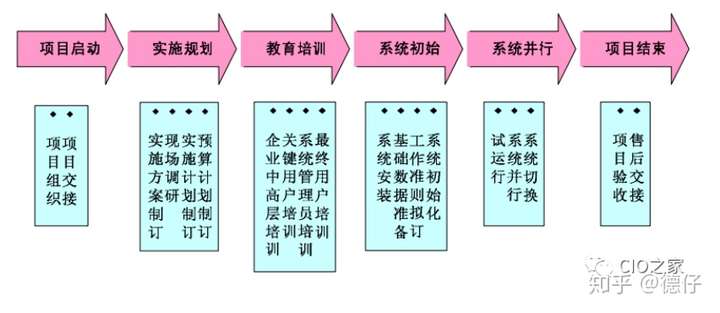 以签订合同为标志,项目进入实施阶段,实施步骤分为项目启动、实施规划、教育培训、系统初始、系统并行、项目结束六个阶段,每个阶段需要完成特定的任务,达成预定的目标,形成阶段工作成果。如图所示:
