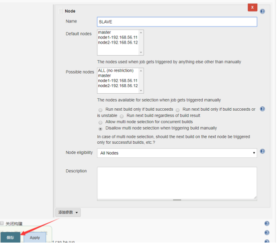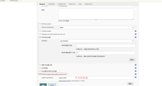 注:我们可以多个slave配置同一个标签,系统随机将任务调派到不同的节点。也可以做到高可用,避免一个slave宕机,整个构建不能执行。