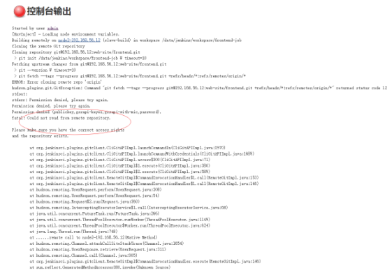 我们发现构建失败,查看输出,发现失败的原因是node2:192.168.56.12不能从Gitlab上拉取代码,因为我们没有配置node2访问gitlab的SSH Key。