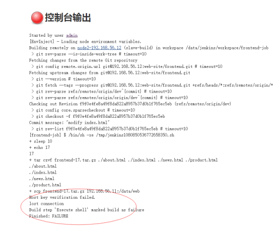 同样构建失败,再次查看详细信息,发现失败的原因是我们没有做node2:192.168.56.12到192.168.56.11我的免密登录,执行发布命令失败。