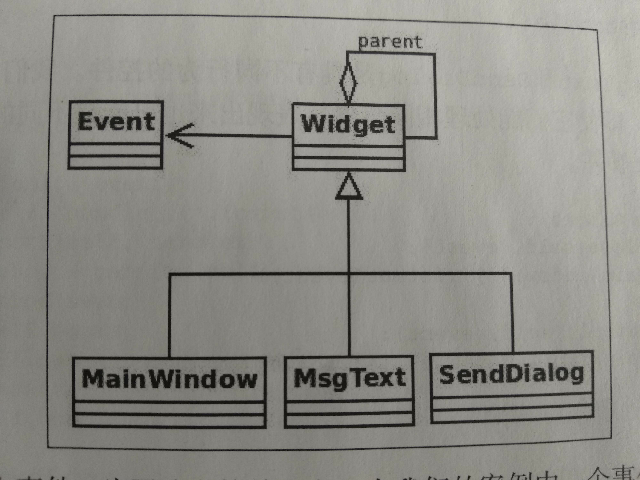 class Event: def __init__(self, name): self.name = name def __str__(self): return self.name class Widget: def __init__(self, parent=None): self.parent = parent def handle(self, event): handler = 'handle_{}'.format(event) if hasattr(self, handler): method = getattr(self, handler) method(event) elif self.parent: self.parent.handle(event) elif hasattr(self, 'handle_default'): self.handle_default(event) class MainWindow(Widget): def handle_close(self, event): print('MainWindow: {}'.format(event)) def handle_default(self, event): print('MainWindow Default: {}'.format(event)) class SendDialog(Widget): def handle_paint(self, event): print('SendDialog: {}'.format(event)) class MsgText(Widget): def handle_down(self, event): print('MsgText: {}'.format(event)) def main(): mw = MainWindow() sd = SendDialog(mw) msg = MsgText(sd) for e in ('down', 'paint', 'unhandled', 'close'): evt = Event(e) print('\nSending event -{}- to MainWindow'.format(evt)) mw.handle(evt) print('Sending event -{}- to SendDialog'.format(evt)) sd.handle(evt) print('Sending event -{}- to MsgText'.format(evt)) msg.handle(evt) if __name__ == '__main__': main()