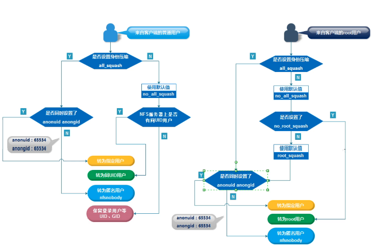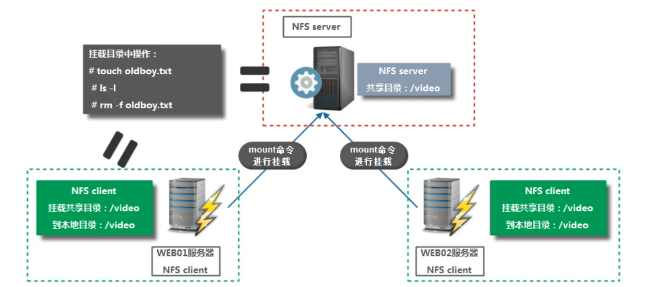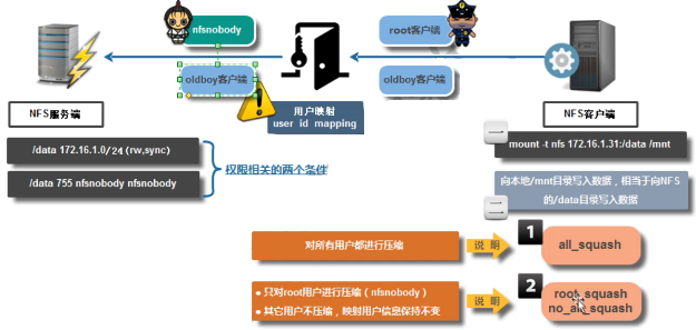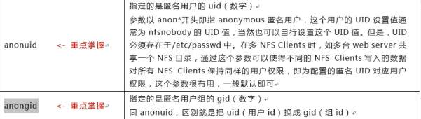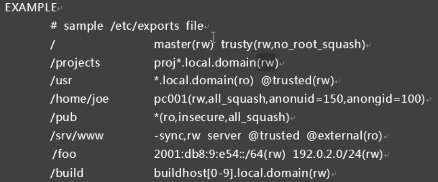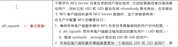 配置例一 /data 10.0.0.0/24(rw,sync) 说明:允许客户端读写,并且数据同步写入到服务器端的磁盘里 注意:24和“(”之间不能有空格 配置例二 /data 10.0.0.0/24(rw,sync,all_squash,anonuid=2000,anongid=2000) 说明:允许客户端读写,并且数据同步写到服务器端的磁盘里,并且指定客户端的用户UID和GID。 早期生产环境的一种配置,适合多客户端共享一个NFS服务单目录, 如果所有服务器的nfsnobody账户UID都是65534,则本例没什么必要了。 早期centos5.5的系统默认情况下nfsnobody的UID不一定是65534,此时如果这些服务器共享一个NFS目录, 就会出现访问权限问题。 配置例三 /home/oldboy 10.0.0.0/24(ro) <-- 是为开发人员想查看线数据准备配置方式 说明:只读共享 用途:例如在生产环境中,开发人员有查看生产服务器日志的需求,但又不希望给开发生产服务器的权限, 那么就可以给开发提供从某个测试服务器NFS客户端上查看某个生产服务器的日志目录(NFS共享)的权限, 当然这不是唯一的方法, 例如可以把程序记录的日志发送到测试服务器供开发查看或者通过收集日志等其它方式展现
