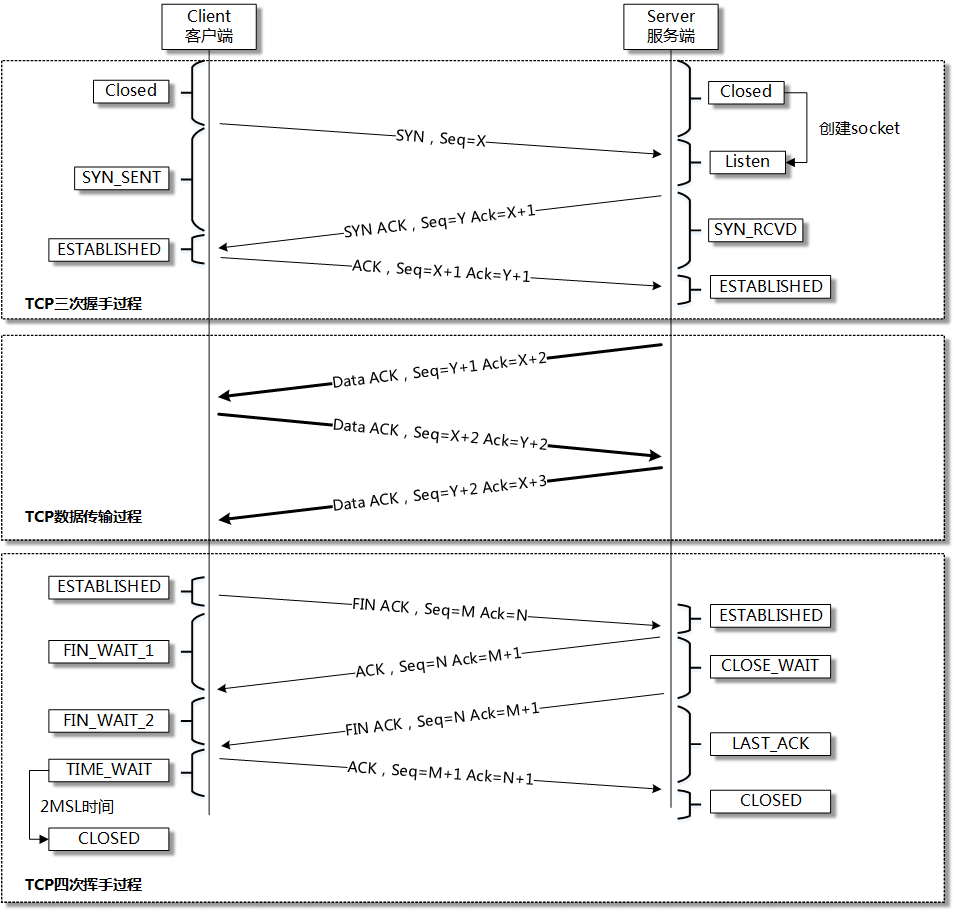 TCP建立连接 1、请求建立连接 syn 2、连接确认再请求 ack、syn 3、最后确认、即建立 ack TCP断开连接 1、请求连接断开 fin 2、断开请求确认 ack 3、思考后断开 fin、ack 4、最后确认,即断开 ack