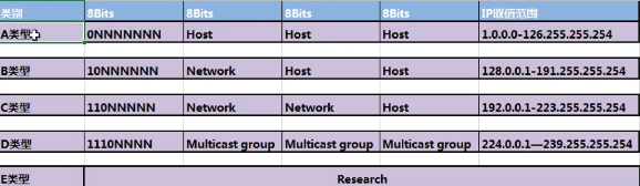 - 按照IP地址数值范围划分(A B C 类 D类 组播地址 E 预留研发使用)