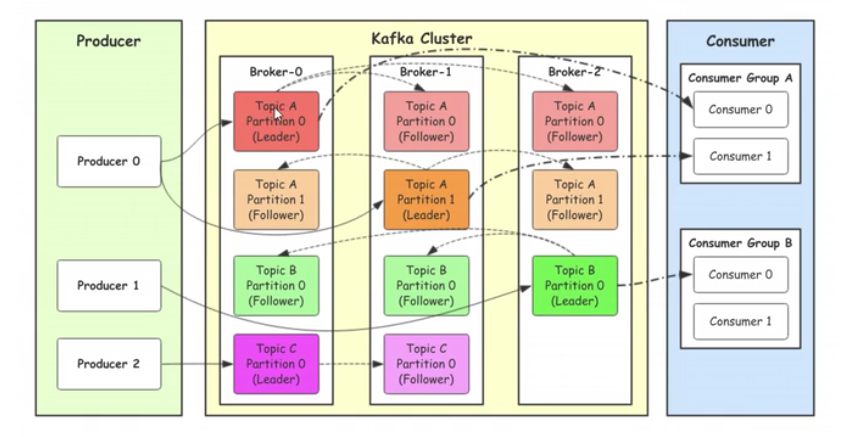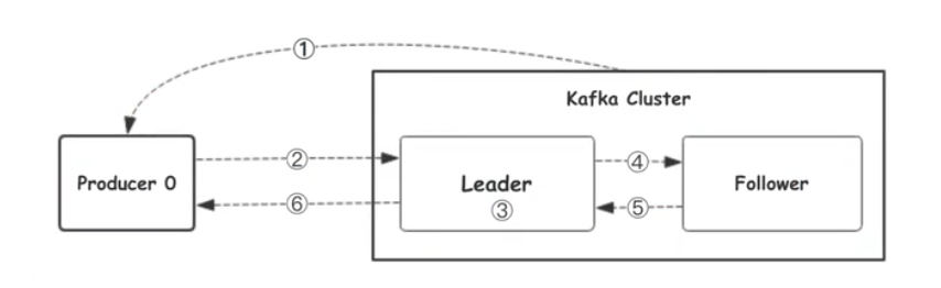 1、生产者从kafka集群获取分区leader信息 2、生产者将消息发送给leader 3、leader将消息写入本地磁盘 4、follower从leader拉取消息数据 5、follower将消息写入本地磁盘后向leader发送ACK 6、leader收到所有follower的ACK之后向生产者发送ACK