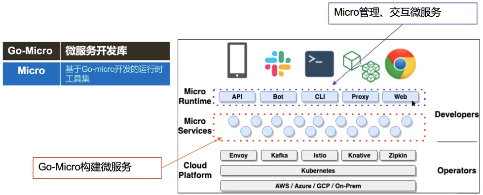 Go-Micro 与Micro 两个项目的关联 Go-Micro是框架、不是服务,但是使用它来编写微服务 Micro(运行时工具集)是基于GO-Micro编写,面向go-micro服务治理与生态的工具集,包含很多服务和工具