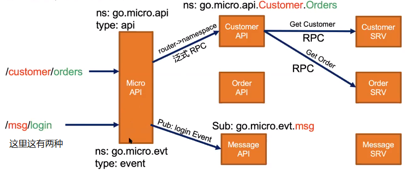 1、API 将http请求映射到API接口 (req->micro api(网关层) -> xx api(聚合层) -> xx srv(服务层))