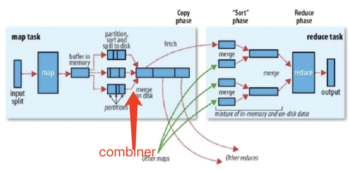 - 再将所有的数据写入瓷盘中的一个文件中(此时,相同的key(分区键)是挨着的;方便reduce获取