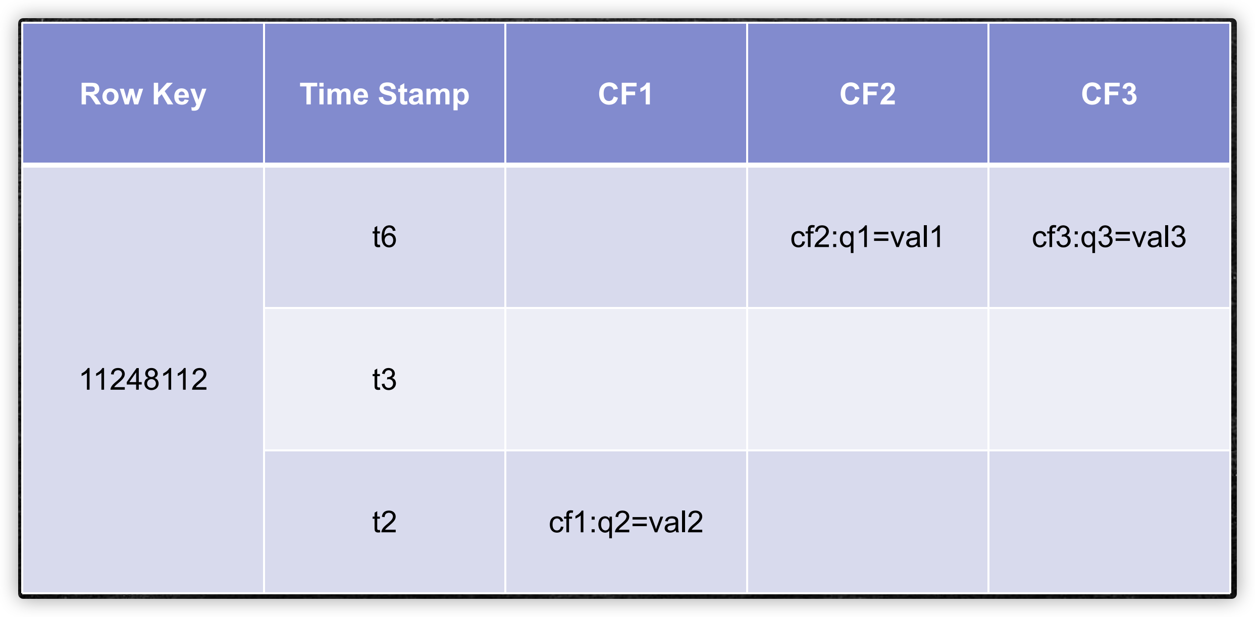 由row key、 cloumn(=<family>+<qualifer>)、version唯一确定数据