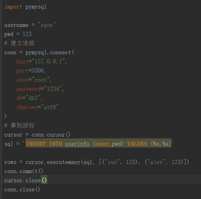 import pymysql user="egon1" pwd= 123 #先链接,拿到游标 conn=pymysql.connect(host='localhost',user='root',password='1234',